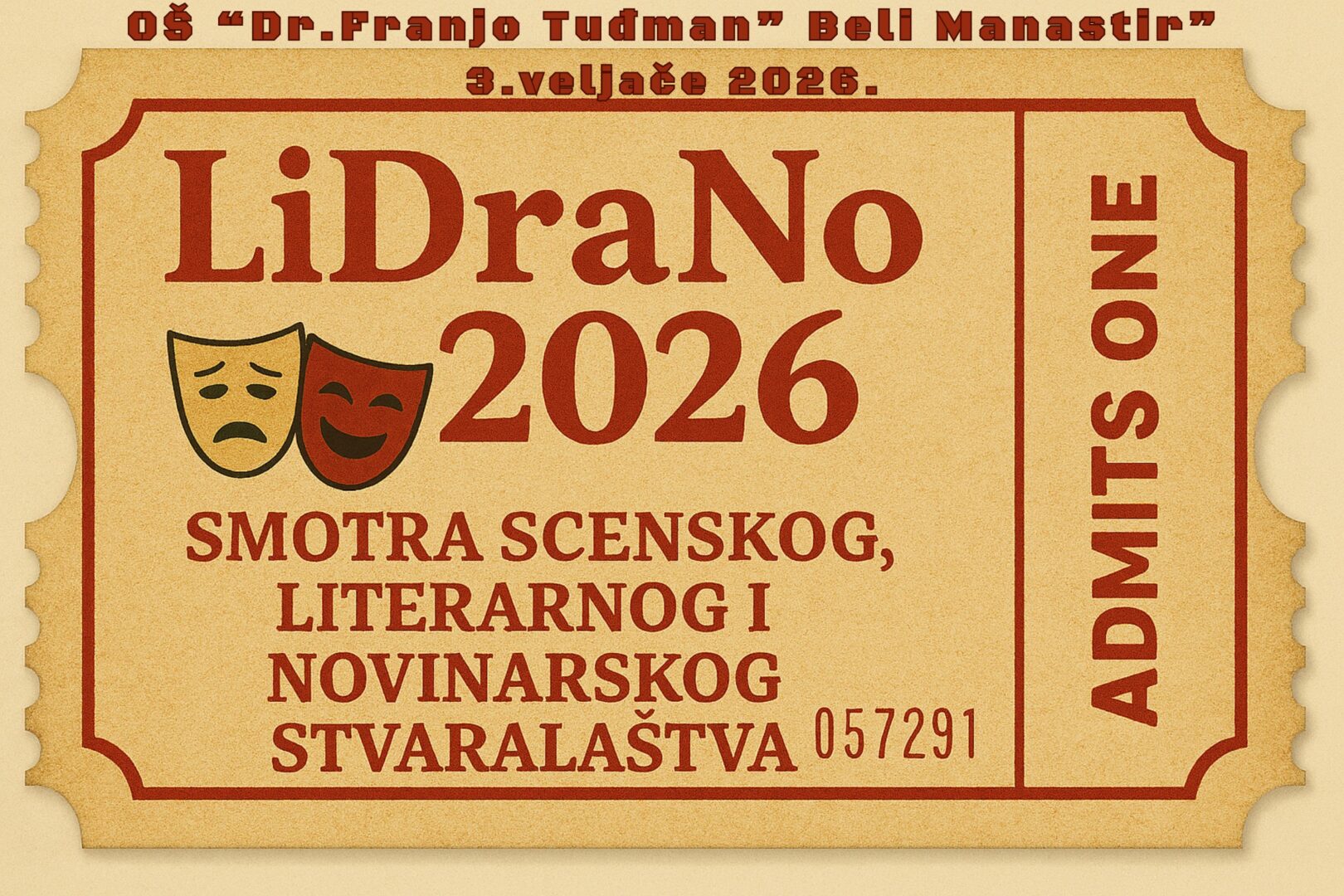 U utorak, 3. veljače 2026. godine, u Osnovnoj školi „Dr. Franjo Tuđman“ u Belom Manastiru održana je Međurazinska smotra LiDraNo 2026. Naš učenik 8. razreda, Luka Molnar, uspješno se predstavio monologom te se plasirao na županijsku razinu smotre.
